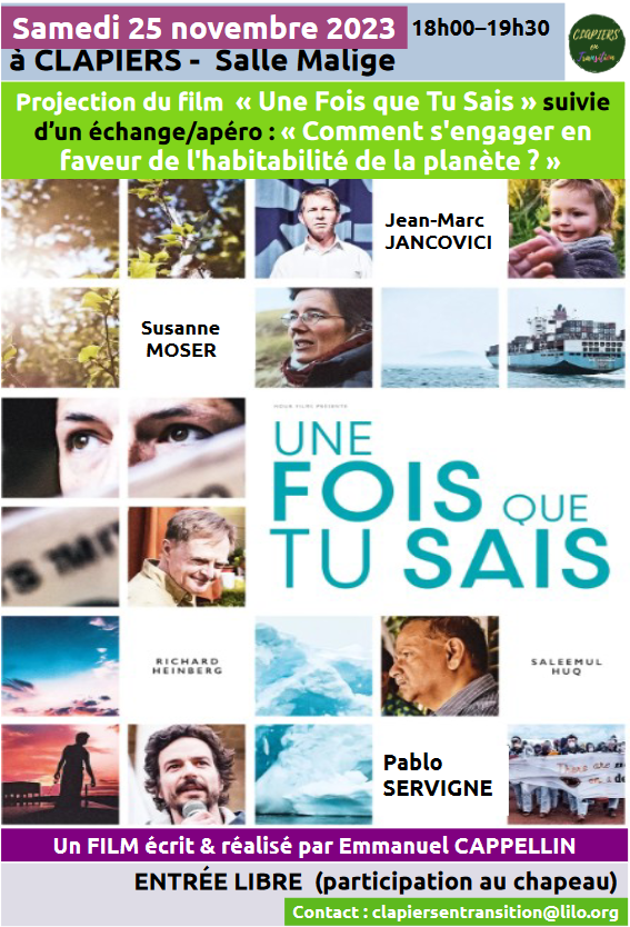 Dans la foulée de la projection du documentaire Une Fois Que Tu Sais d’Emmanuel Cappellin à Clapiers, nous vous avons parlé de l’arbre aux action. Difficile de ne as être ému par le discours sans fioritures et sans concession de Jean-Marc Jancovici, l’engagement de Saleemul Hug, vétéran des COP, infatigable défenseur de la cause des pays du sud, mort en octobre 2023. En visite dans le delta du Bangladesh, il avertit les occidentaux : ces habitants sont les champions de l’adaptation. Quand ils ne pourront plus s’adapter, ils déferleront sur vous. Ému par le poignant témoignage de Richard Heinberg dans sa cuisine – le réalisateur a dû couper – sensible âme artistique au destin happé par la question de la fin du pétrole : once I understood, all other problems receeded in importance. Et Susanne Moser en plein amphi en temps de confinement covid, qui appelle quasiment les étudiants à l’insurrection contre Trump.