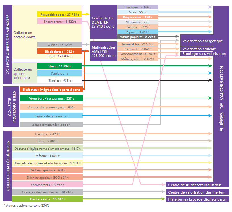 Comme vous savez, la gestion des déchets est une compétence de la Métropole. Chaque année, les conseils municipaux des 31 communes sont informés de ce rapport sur le Prix et la Qualité du Service Public. Les élus municipaux prennent acte, il n’y pas de débat ni de vote en tant que tel. C’est un document de 50 pages qui retrace le contexte et les actions de l’année, évalue la politique de déchets. Ce document inclut page 21 ce diagramme, censé illustré de façon synthétique les flux de déchets: