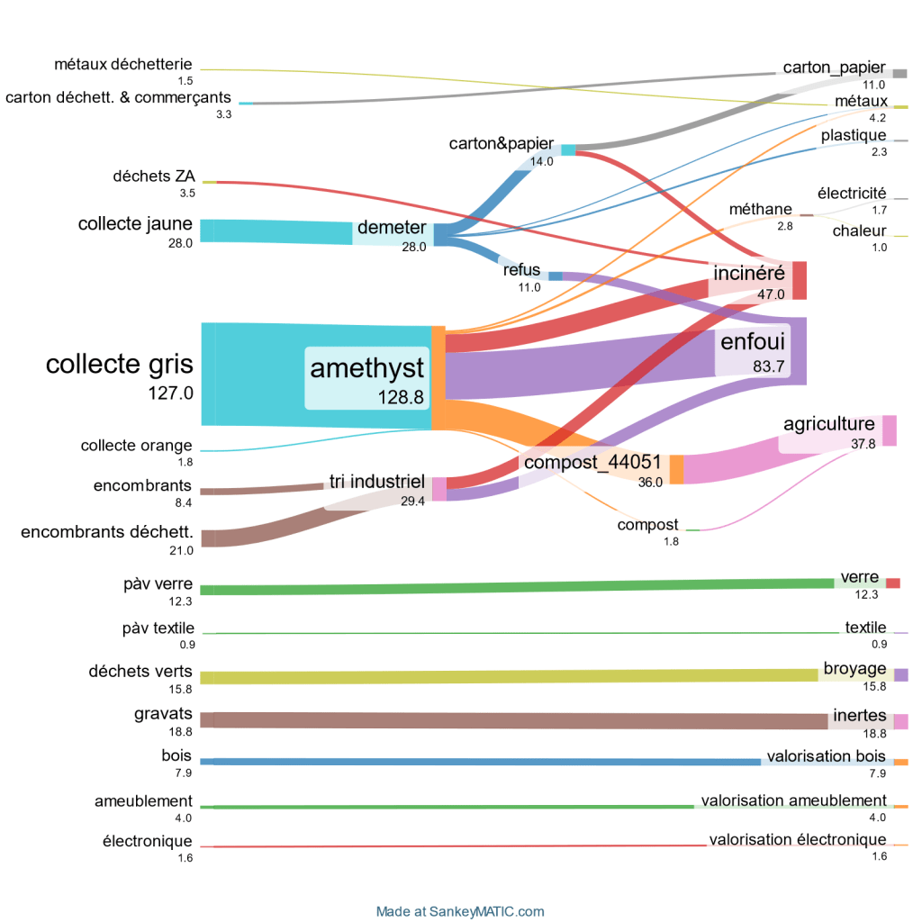 - Notre graphique distingue deux flux de compost, un petit et un gros, qui passent tous deux dans l’usine Améthyst, mais dans des digesteurs séparés, donc qui ne se contaminent pas l’un l’autre. Cela est représenté par une production de compost de qualité, issue de la collecte en bac orange et d’activité commerciale (résidus de marchés…) et composté à part, pour un petit flux d’environ 1 700 t par an. Ce compost est de bonne qualité, sans plastique, et propre à une utilisation en agriculture – quoique pas un compost bio