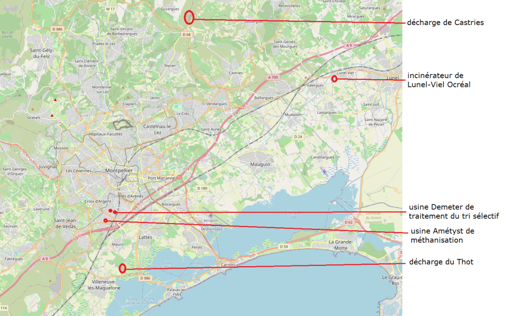Depuis 2019, Montpellier n’a plus d’exutoire pour ses déchets. Ils sont donc exportés en 2023 vers six décharges et deux incinérateurs de la région Occitanie. Ces sites sont distant de 23 à 250 km de l’origine des déchets, l’usine de méthanisation Amétyst. Nos déchets font donc du tourisme.