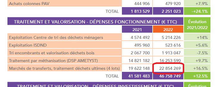 Cette infographie révèle des données qui à notre connaissance n’étaient pas publiques. en tout cas pas présentes dans les Rapport annuels sur le Prix et la Qualité du Service Public des déchets (RPQS) déchets soumis aux élus.