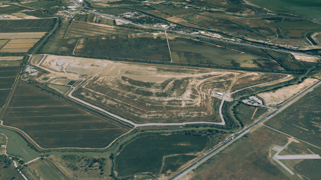 Photo satellite du Thot en 2006, vue en direction du nord-est. On voit le terrain d’aéro modélisme en bas à droite. On voit l’appendice nord de la colline (à gauche de l’image) encore actif à cette époque. Le mont au centre correspond aux déchets accumulés depuis les années 1960. Le terrain naturel est parfaitement plat à cet endroit, paysage de roselières en bord d’étang. On devine le cours serpentueux de la Mosson