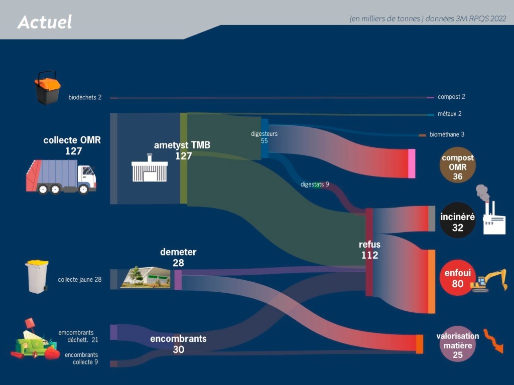 Voici le flux actuel des déchets. Les données sont celles du rapport annuel (RPQS) sur l’année 2022, présenté aux élus pour information à l’automne 2023. Ces chiffres sont les chiffres de la Métropole