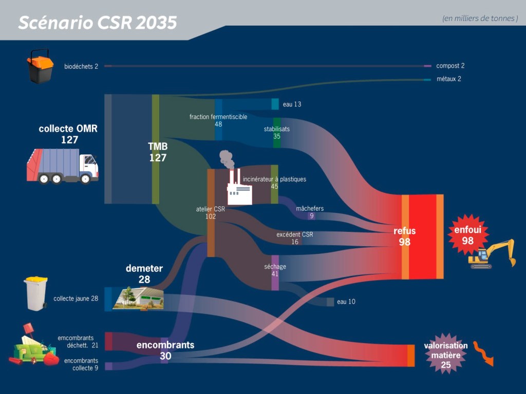 Sur le modèle deux scénarios présentés ci-dessus. actuel et zéro déchets, nous mettons en graphique avec les mêmes règles de représentation et la même échelle, nos hypothèses sur le scénario CSR 2035. Oui, 2035, parce qu’une filière opérationnelle en 2030, on n’y croit pas. Comme on l’a vu dans un précédent article, ces hypothèses diffèrent sensiblement de celle présentées aux élus Métropolitains le 1er mars 2024 et notre article les justifiait point par point.